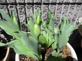 黄色い花の「新拓」は2年目の球根のせいか、今年は変なつぼみがついています。