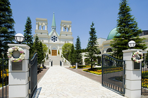 以前通りかかったときは、丁度鐘がなってたくさんの風船が空に放たれ、奥の扉から新郎新婦が出てくるのを参列者が階段脇で迎えていました。