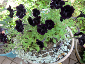 黒に近い濃い紫の中輪のペチュニア(エスプレッソ・トリュフ)には、白いユーフォルビア・ダイアモンドフロストと、庭に生えていた白い葉のつるを合わせました。