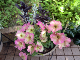 こちらは絞りの入ったピンクのペチュニア(デボネア・ダスティローズ)に濃い紫のバジル(レッドルビンバジル)、白い葉に小さい黄色い花を付けるエレモフィラ・グラブラを合わせた、ちょっとアンニュイな感じ?の寄せ植えにしてみました。