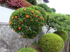 丸く刈り込まれた植木に鮮やかなオレンジ色の花が咲いていました。