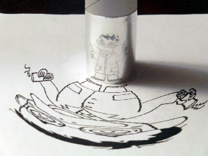 3月の実験教室で、銀鏡反応の実験をします。本来はちょっと危険な薬品を使うのですが、今回は写真の白黒フィルムから銀を析出する子供向けな実験です。ミニボトルの内側に銀の膜ができて鏡のようになるので、クラブの公式キャラクターが写るアナモルフォーズ(歪像画)を作ってみました。初めは方眼を使って自力で描くつもりでしたが、探せばちゃんと自動作成ソフトがあるんですね。今回はサンプルで紙筒にアルミ箔を巻いていますが、当日うまく反応すればピカピカの円筒鏡が出来ると思うのでお楽しみに~