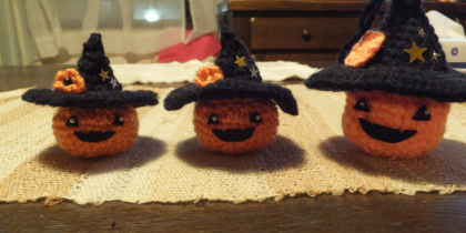 昨年、女子大生に好評だった編みぐるみのかぼちゃ魔女、今年は少し細めの毛糸でひとまわり小さく作ってみました。