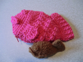 手芸本の「たい焼き」の編み図に一目ぼれして、濃いピンクの並太毛糸で大きめに編んでみました。